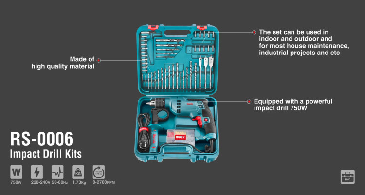 این مجموعۀ ترکیبی، از یک دریل چکشی 750 وات و انواع پیچ و مته کاربردی تشکیل شده است. این ست ترکیبی، برای استفاده در مصارف خانگی و صنعتی مناسب بوده و در صنایع چوبی، فلزی و ساختمانی مورد استفاده قرار میگیرد.