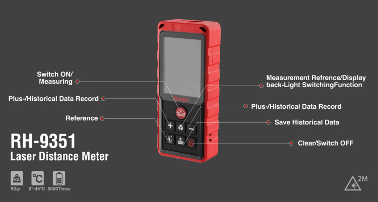 متر لیزری RH-9351 رونیکس برای اندازهگیری و فاصلهیابی دقیق نقاط مختلف مورد استفاده قرار میگیرد. از این ابزار اندازهگیری پرکاربرد رونیکس در خانه، صنایع مختلف و ساختمانسازی برای اندازهگیری طول، مساحت، حجم، ارتفاع غیر مستقیم (فیثاغورث تک-دوبل-مقطعی) و ... استفاده میشود.