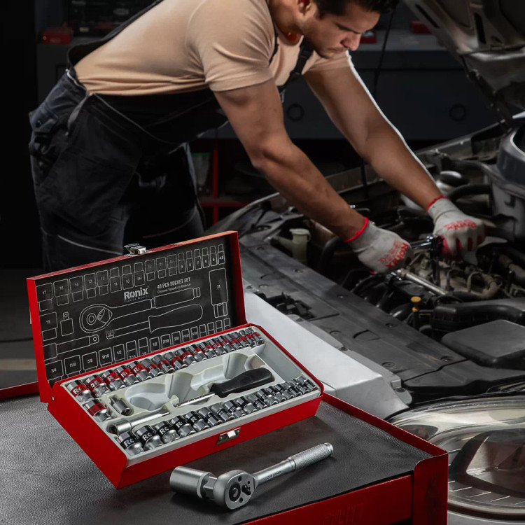 - مجموعه ای شامل 40 قطعه سوکت که برای افزایش گشتاور و بالاتر رفتن دوام از فولاد کروم وانادیوم تولید شده اند