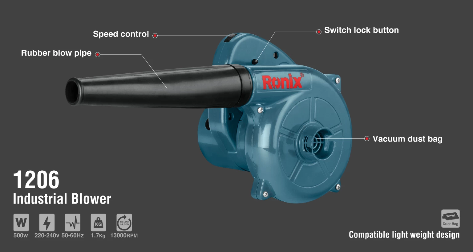 بلوور برقی یا دستگاه دمنده و مکنده 1206 رونیکس، با موتور قدرتمند 500 وات خود، سرعتی معادل با صفر تا 13000 دور بر دقیقه را متناسب با کاربری مورد نظر ایجاد میکند. این دستگاه قدرتمند، با تولید حداکثر جریان هوای 2.3 متر مکعب در دقیقه به کاربر کمک میکند تا به راحتی گرد و غبار را از روی سطح مختلف بزداید. دیمر تنظیم سرعت، تنظیم دور موتور را در 6 حالت مختلف امکانپذیر میکند.