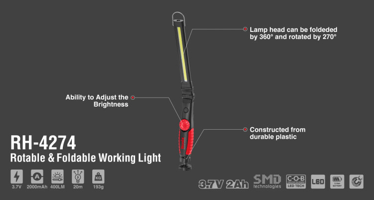 چراغ کار تاشو و قابل چرخش شارژی رونیکس 3.7 ولت 400 لومن مدل RH-4274 (دارای مگنت)