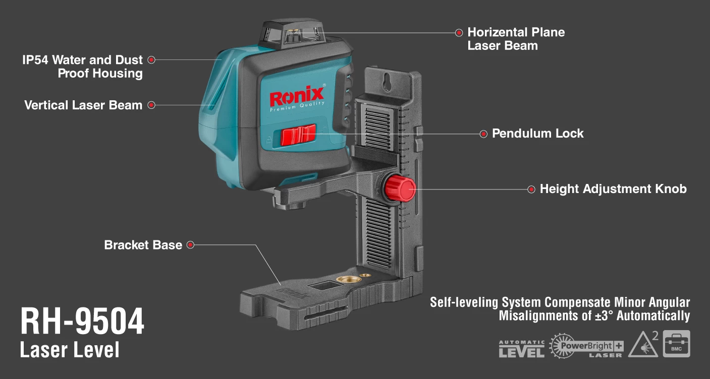 تراز لیزری RH-9504 رونیکس، یکی از ابزارهای اندازهگیری دقیق این برند و با دامنه خودترازی با دقت °3± است. پرتوهای لیزر این تراز، در زوایای 360 و 120 درجه عمودی و افقی از این ابزار منتشر میشوند. برد این ابزار 15 متر است و با استفاده از رسیور، به 50 متر میرسد تا از آن در فضاهای بیرونی نیز استفاده کرد.