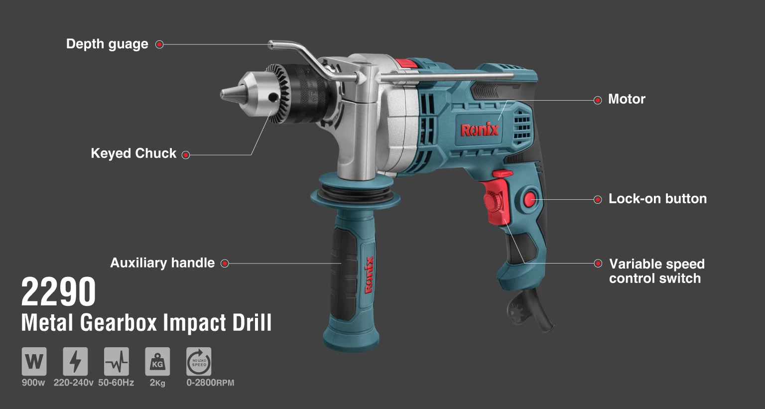 دریل چکشی نیمتنه فلزی 2290 رونیکس، انتخابی مطمئن، حرفهای و بیرقیب در کاربردهای مختلف است. این دستگاه، مجهز به موتور کارآمد و قدرتمند 900 وات است و با طراحی مهندسی و دوام بالا، عملکرد فوقالعادهای را در سختترین مواد و مصالح از خود نشان میدهد. این موتور فوق صنعتی، قادر است سرعتی بالغ بر 2800 دور بر دقیقه را ایجاد کند.