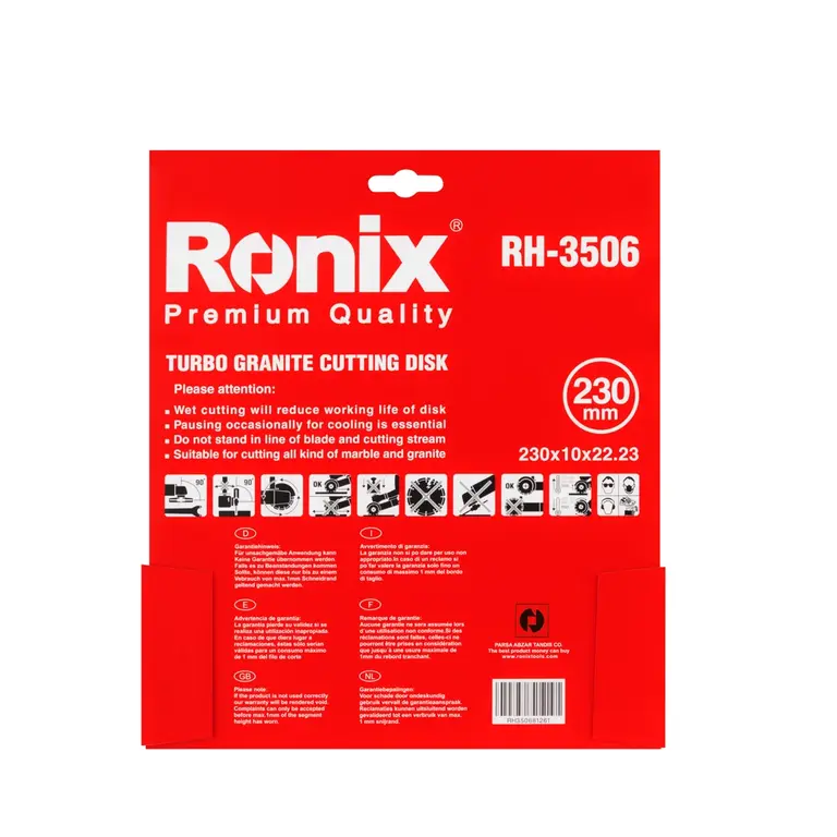صفحه گرانیتبر 230 میلیمتری RH-3506 رونیکس، با روش Hot Press و مطابق استانداردهای معتبر بینالمللی، به وسیلهی دستگاههای تماماتوماتیک با تکنولوژی پیشرفته تولید میشود. به همین دلیل، در برابر فشار کاری شدید در سطوح بسیار متراکم گرانیت، مقاومت بسیار بالایی دارد. از این صفحه جهت برشهای خشک و تر انواع گرانیت استفاده میشود. همچنین، سگمنت بلند 10 میلیمتری در کنار تیغه الماسهی باکیفیت آن، برش گرانیت را برای کاربر راحتتر میکند.