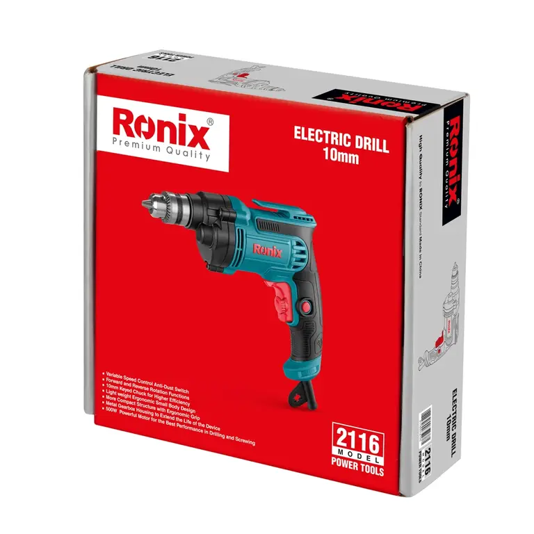 دریل برقی 2116 رونیکس، دارای نیمتنه فلزی است و با موتور پرقدرت 500 وات کار میکند. همچنین، مجهز به سهنظام دوتکه مستحکم، 10 میلیمتری و آچاری است که بر عملکرد دستگاه تاثیرگذار است. این ابزار برقی کاربردی، با برخورداری از اهرم چپگرد/راستگرد میتواند در کنار عملیات دریلکاری به عنوان پیچگوشتی برقی نیز کار کند.
