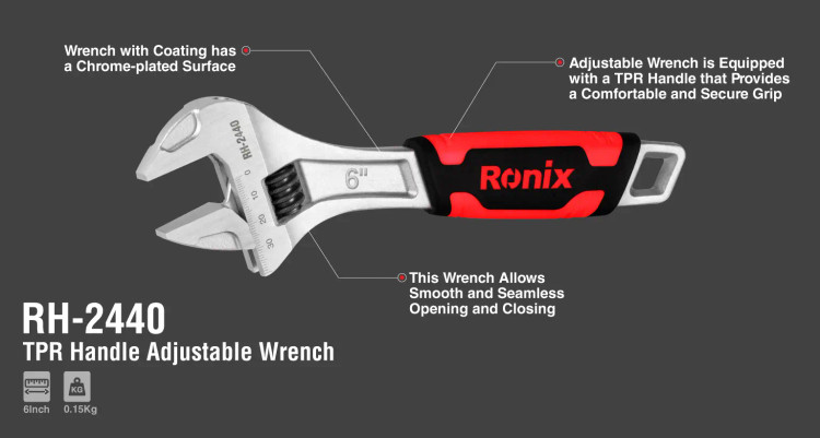 این ابزار به صورت ارگونومیک طراحی شده و دارای دسته TPR است که باعث میشود بتوانید به مدت طولانی از آن استفاده کنید؛ بدون اینکه احساس خستگی کنید. همچنین، روکش لاستیکی دسته آچار فرانسه رونیکس نه تنها از زنگزدگی جلوگیری میکند، بلکه ضد لغزش نیز است و ایمنی کار را افزایش میدهد.