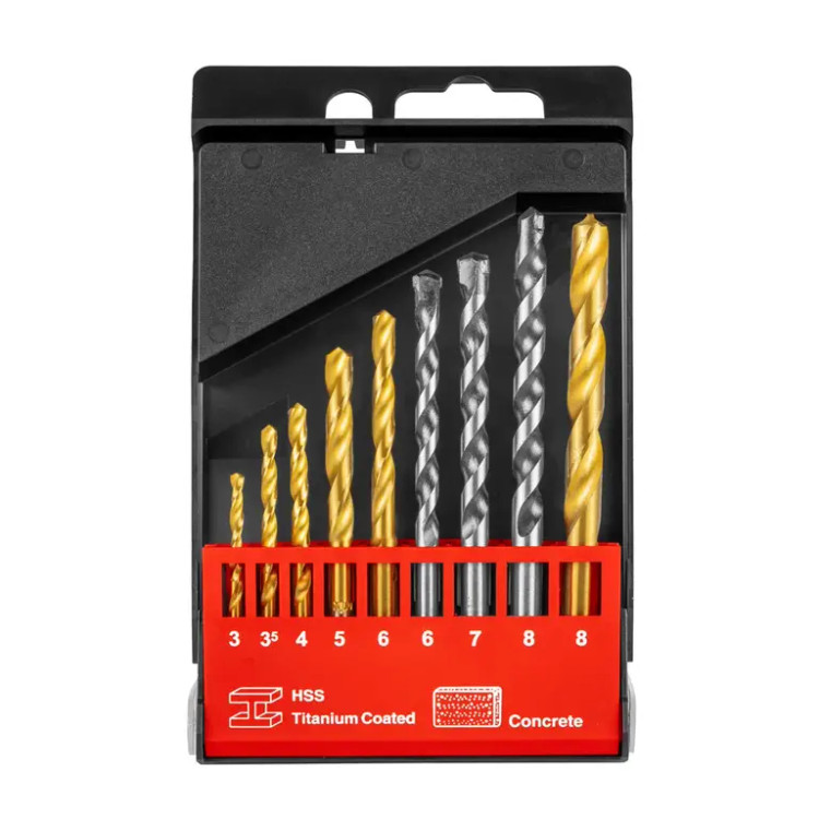 - مجموعهای متنوع از متههای مخصوص سوراخکاری در بتن و سوراخکاری معمولی با روکش تیتانیوم