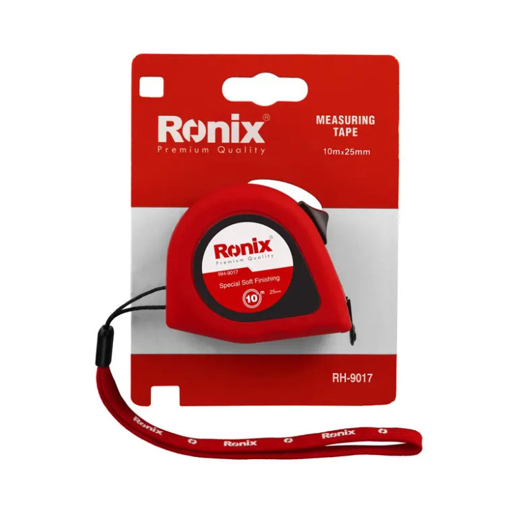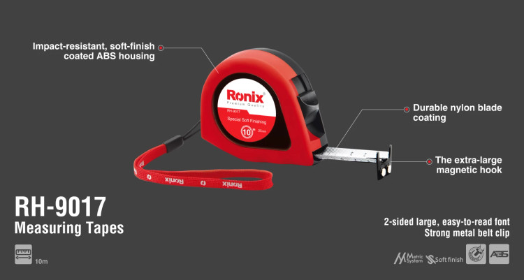 در طراحی متر روکشدار RH-9017 یک گیره فلزی برای آن در نظر گرفته شده تا بتوان به راحتی آن را به کمربند یا جیب لباس کار متصل کرد. از دیگر ویژگی های این متر برخورداری از قلاب دو طرفه آهن ربایی است که امکان کاربری در هر دو طرف را فراهم می کند. متر روکشدار 10 متری رونیکس دارای چاپ دو طرفه سیستم متریک، باعث کاربری آسان آن میشود. -