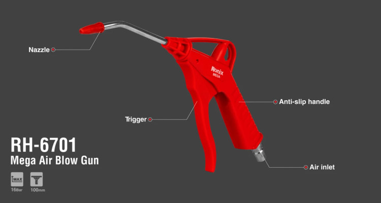 تفنگ بادپاش رونیکس مدل RH-6701 یکی از ابزارهای بادی این برند است؛ منبع تغذیه آن کمپرسور باد است و میتواند باد را با قدرت بالا به سمت سطوح مختلف هدایت کند. این ابزار دارای بدنهای بادوام از جنس POM (پلیاکسیمتیلن یا پلیاستال) است که در برابر آب و روغن مقاوم میباشد.