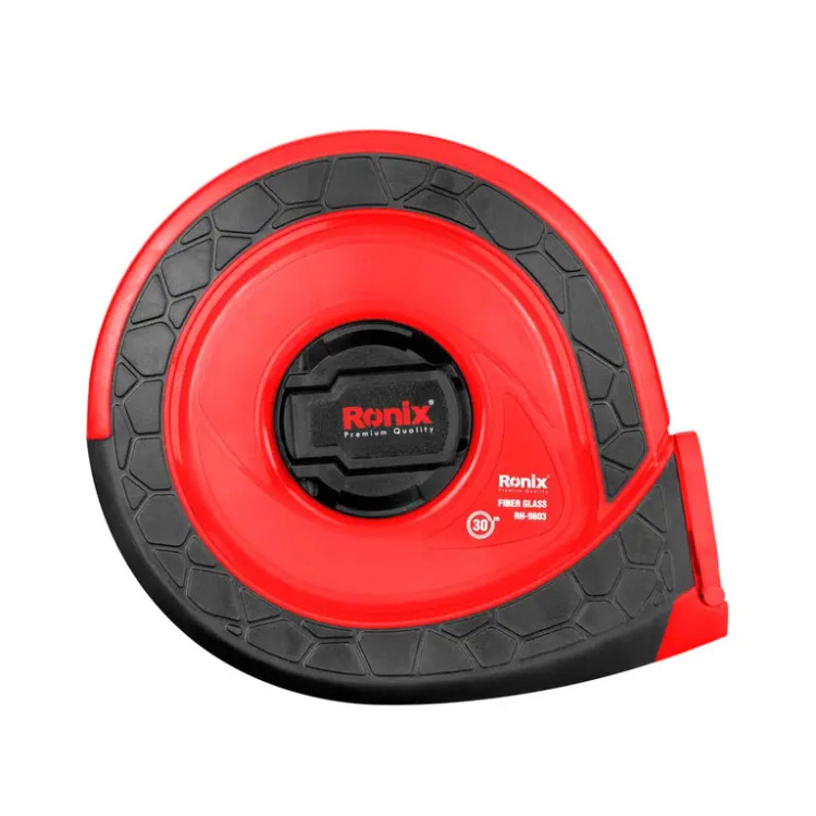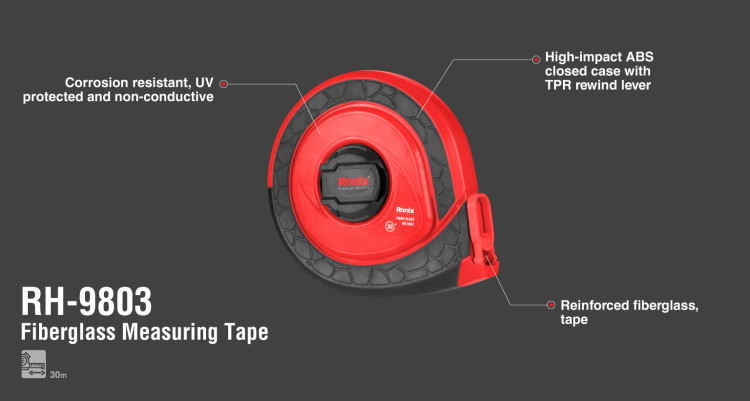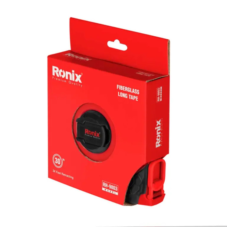 متر RH-9803 رونیکس مجهز به بدنه ای مقاوم در برابر ضربه است. نوار 30 متری این متر از جنس فایبرگلاس است که وزن آن را به طرز چشمگیری کاهش داده است و موجب شده است از مقاومت بالایی برخوردار شود. این متر مجهز به بدنه مقاوم و ضد ضربه است که در برابر آسیب های ناشی از ضربات وارد شده مقاوم است. واحد اندازهگیری طول در این متر برحسب سانتی متر است و در هر دو سمت نوار چاپ شده است. این نوار با روکش PVC به منظور افزایش دوام و نیز قابلیت شستشو پوشیده شده است.