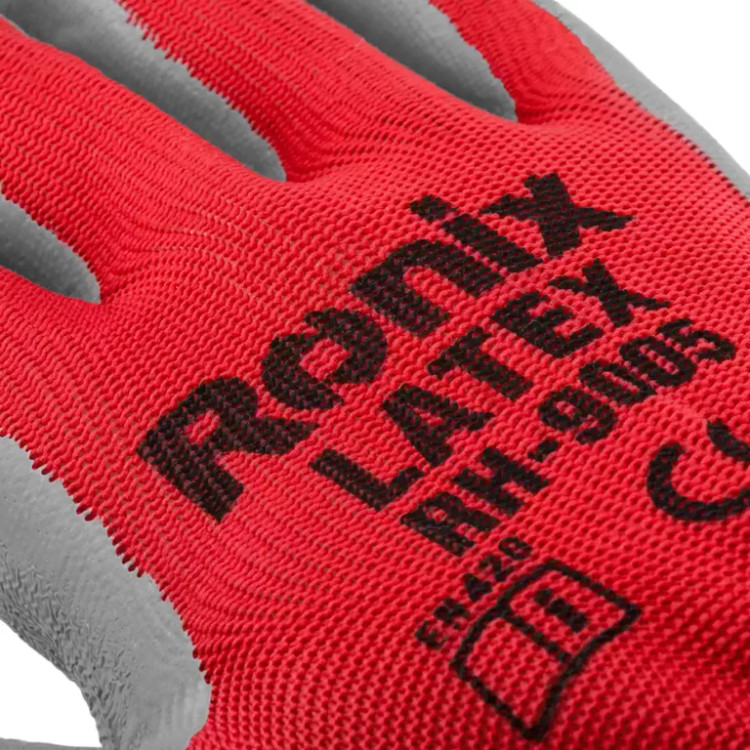 دستکش ایمنی لاتکس کف مواد طوسی ساده نخ قرمز به همراه تگ سبک رونیکس مدل RH-9005
