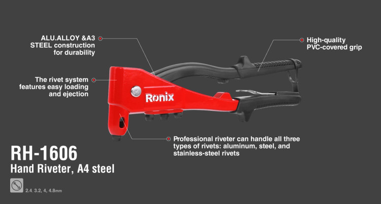 انبر پرچ RH-1606 رونیکس دارای ساختاری محکم و بدنهای سبک از جنس آلومینیوم و فولاد A4 است. این ابزار، انتخابی ایدهآل برای انجام پرچکاریهای کلی، ساخت ناودان، مبلمان، بوم نقاشی و ... میباشد. انبر پرچ دینو برای کار با پرچهای 2.4، 3.2، 4.0 و 4.8 میلیمتری طراحی شده و تمام نیازهای شما را برای پرچکاری پوشش میدهد.