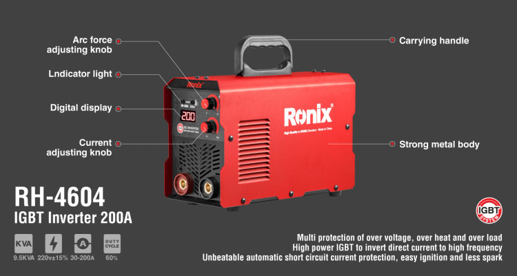 استفاده تکنولوژی توربو فن پلاس در قسمت پشتی دستگاه، 4 دیود 60 آمپر و یک ترانس کاهنده باکیفیت و ظرفیت اشباع بالا، از دیگر ویژگیهای مهم اینورتر RH-4604 رونیکس هستند. اینورتر جوشکاری RH-4604 رونیکس، یک اینورتر 200 آمپر واقعی است که قابلیت 20 دقیقه جوشکاری بیوقفه را با سیمجوشهای روکشدار تا سایز 5 ارائه میدهد.